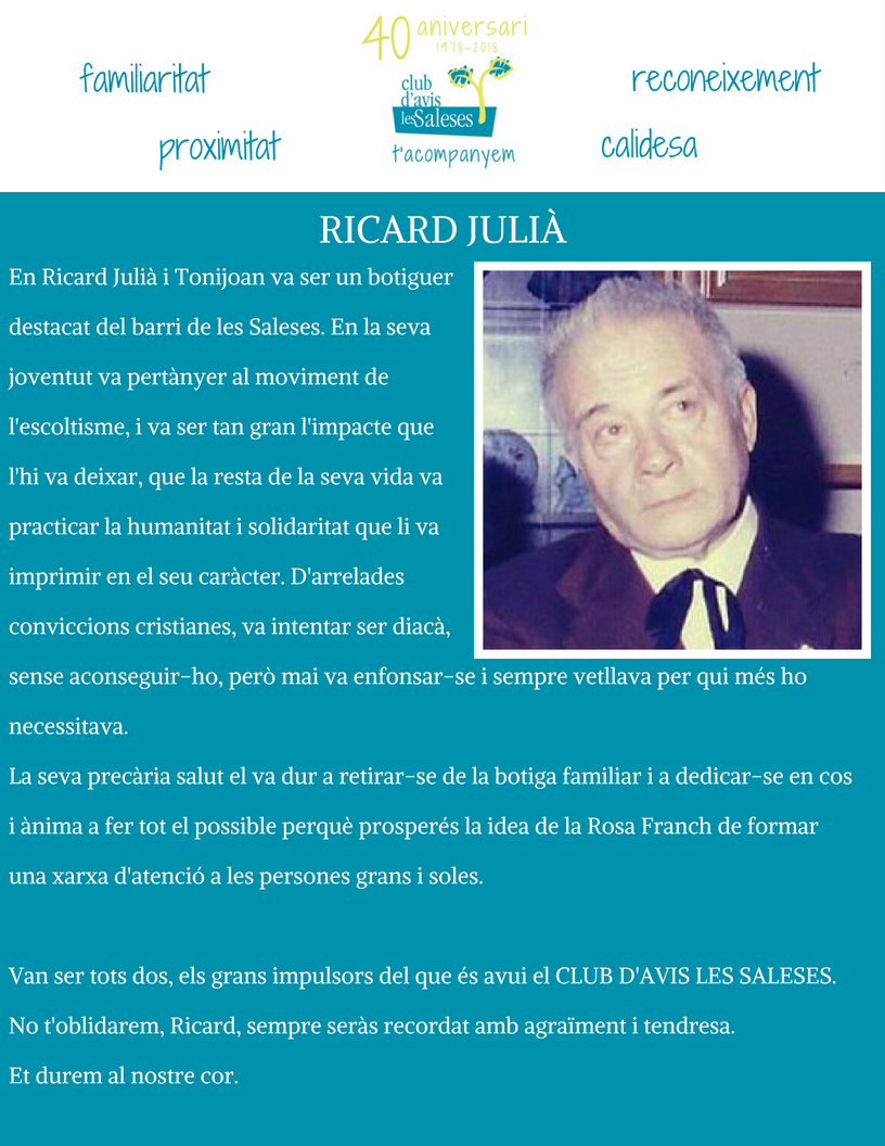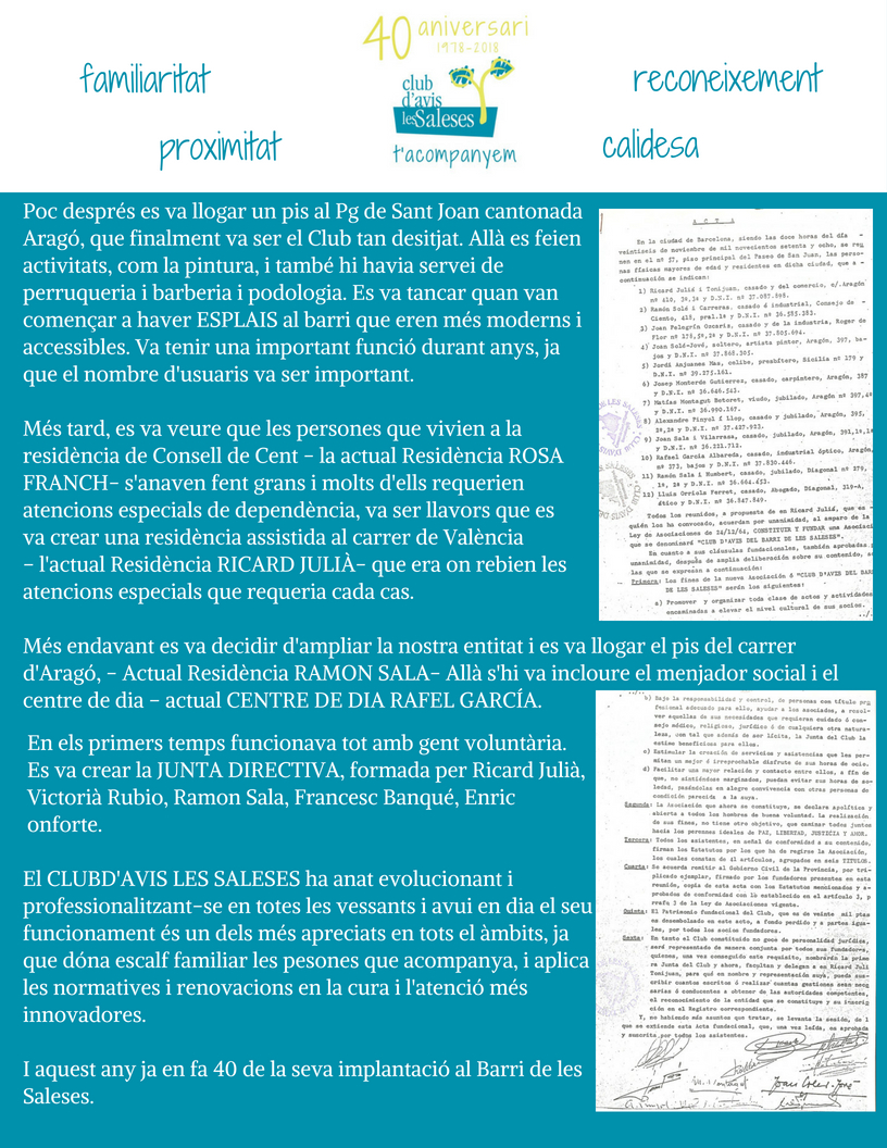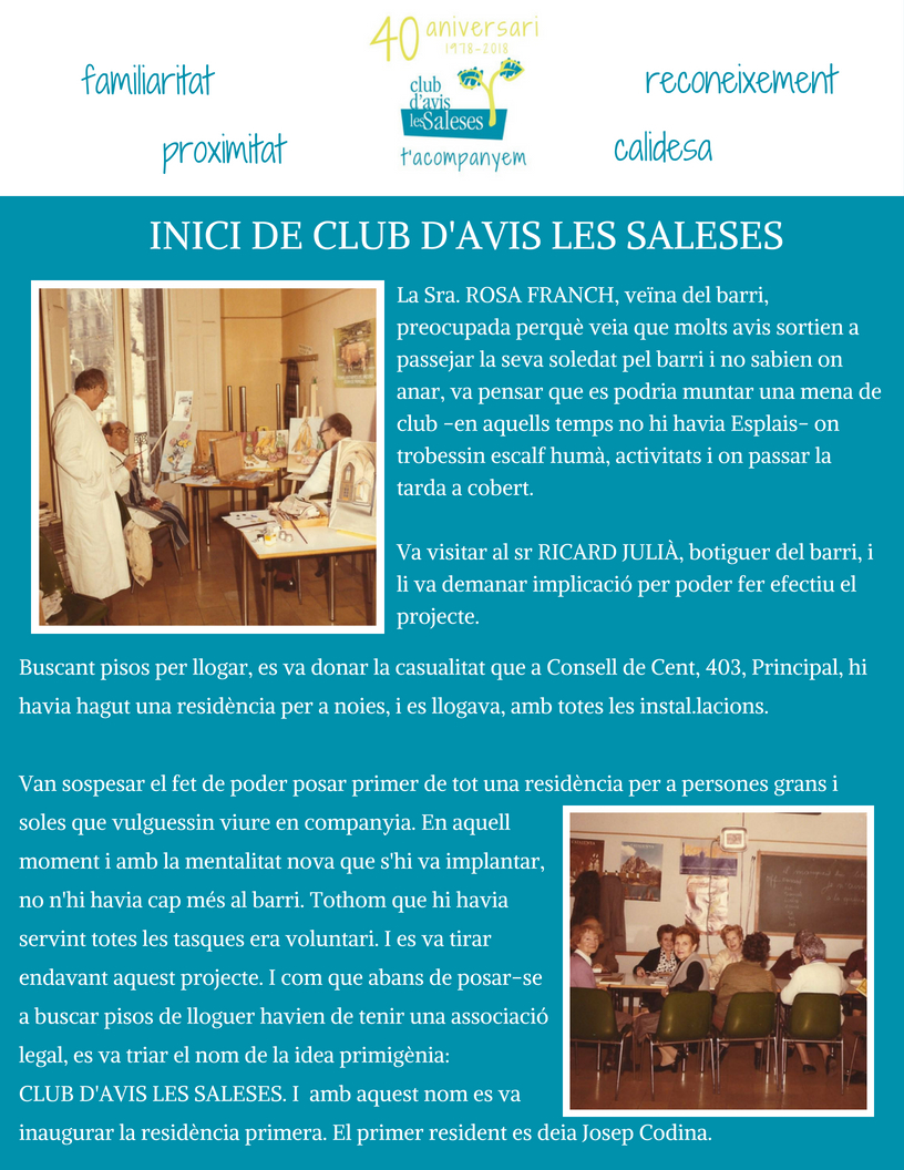 Fa 40 anys que vam iniciar aquest camí incert gràcies a l’empenta i la iniciativa de gent anònima. Persones corrents que van decidir fer alguna cosa pels grans del barri, perquè tinguessin una millor vellesa i una vida digna. Aquest és el nostre petit homenatge a aquestes persones ia tots els que ho han fet possible…